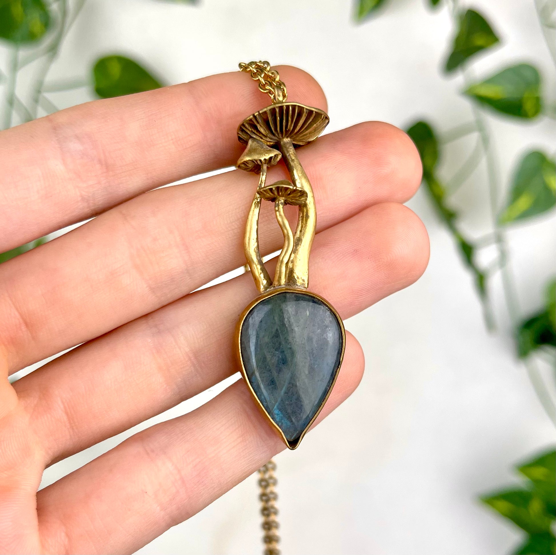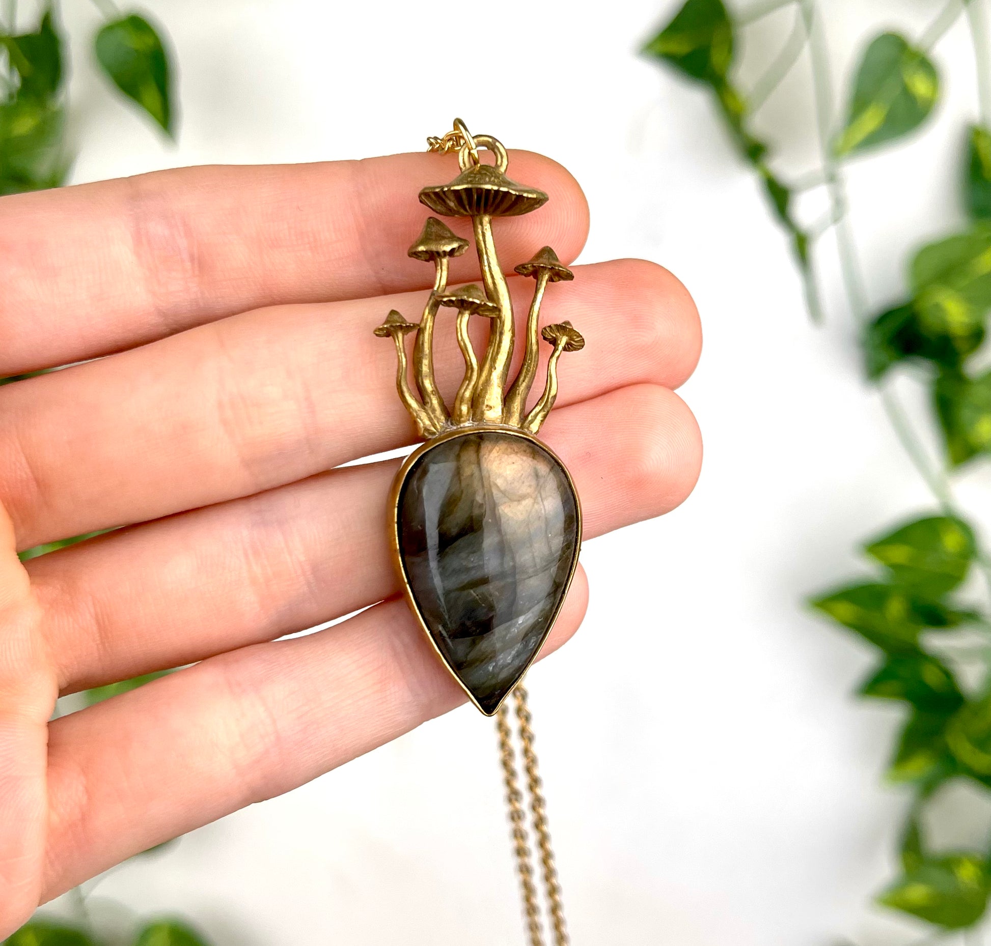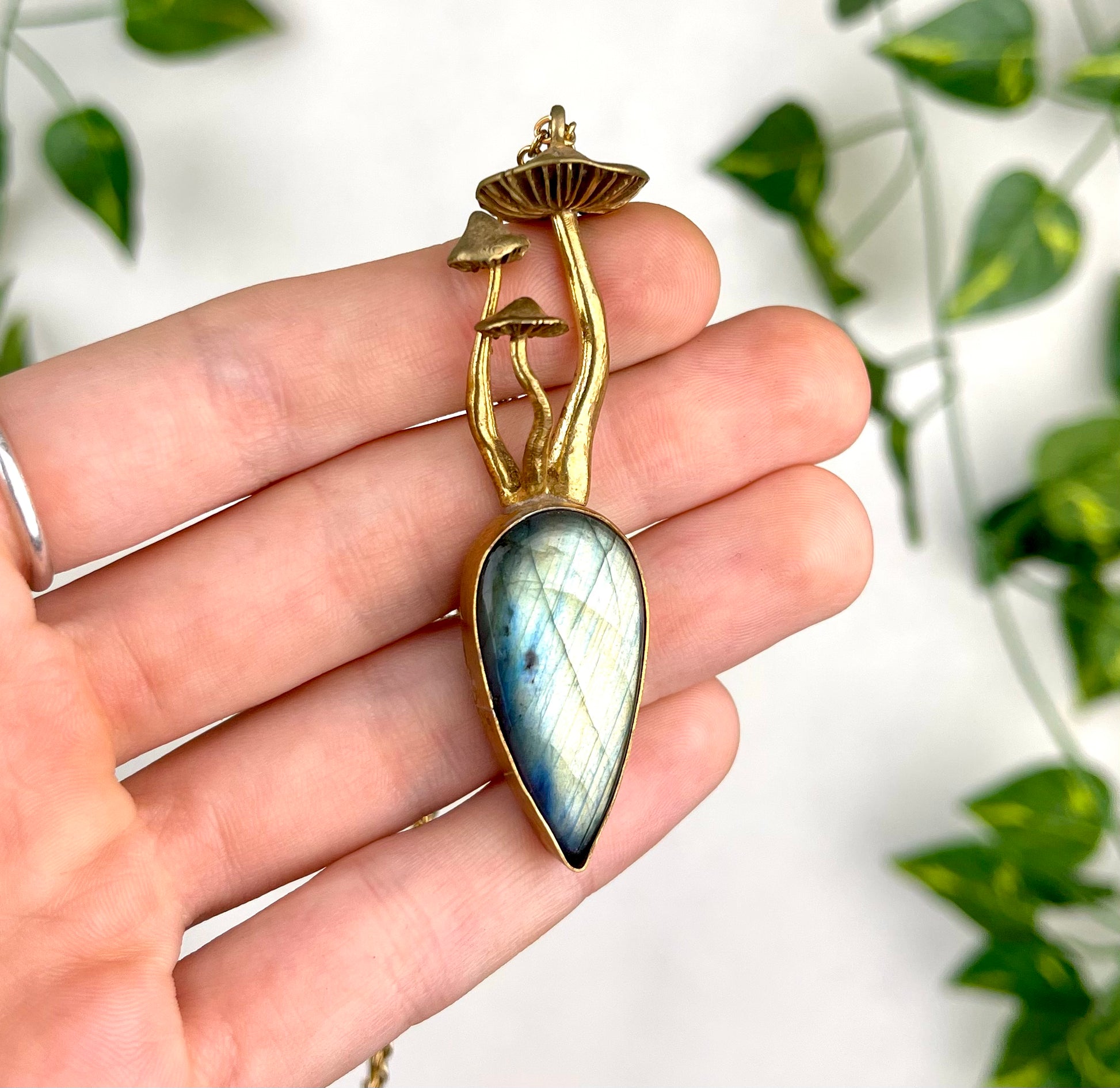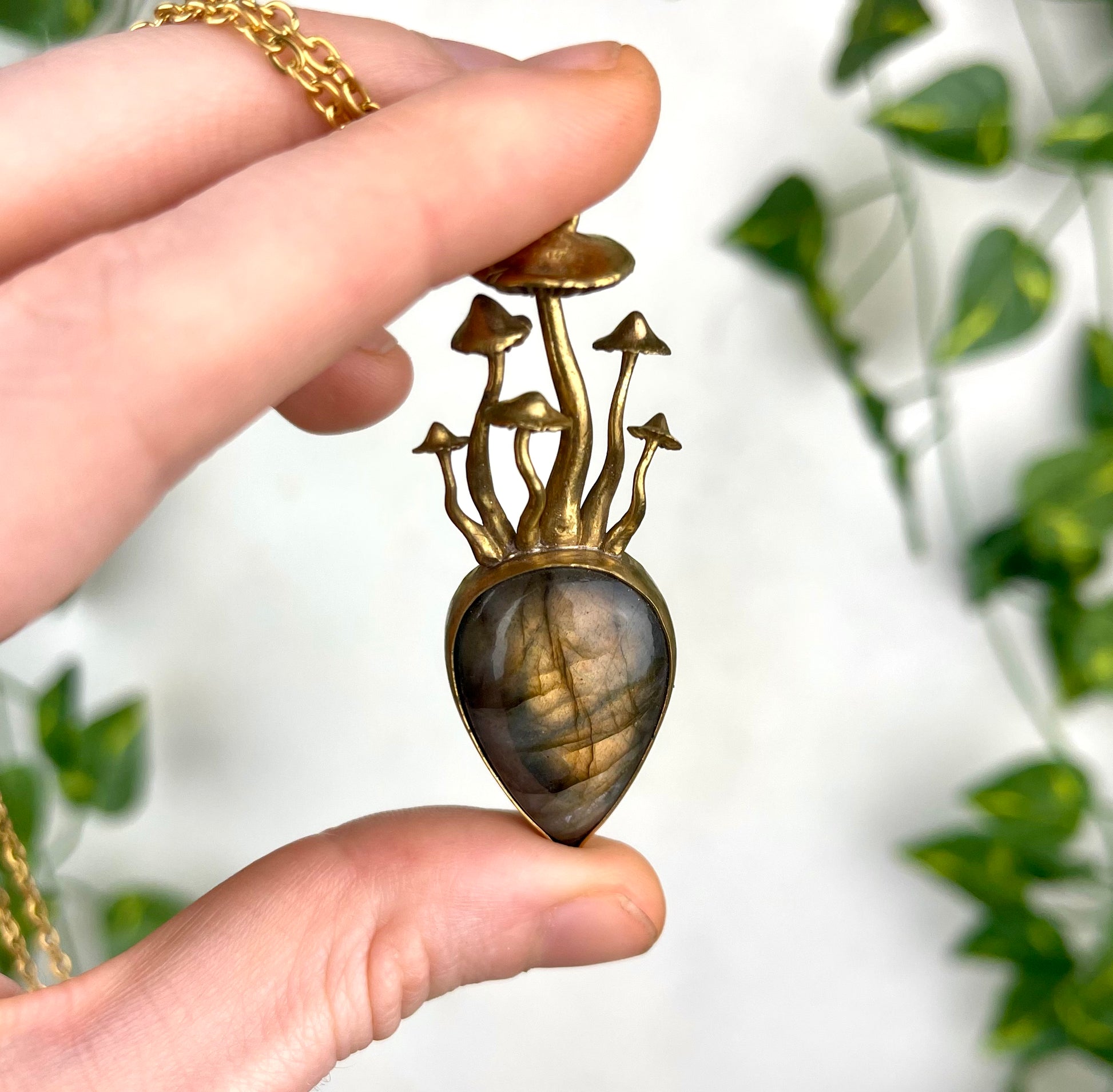 Step into a woodland fairytale with this handcrafted brass mushroom necklace, featuring a captivating Labradorite crystal. This charming piece brings a touch of magical forest whimsy to your style, perfect for nature lovers and dreamers alike! 🍄✨