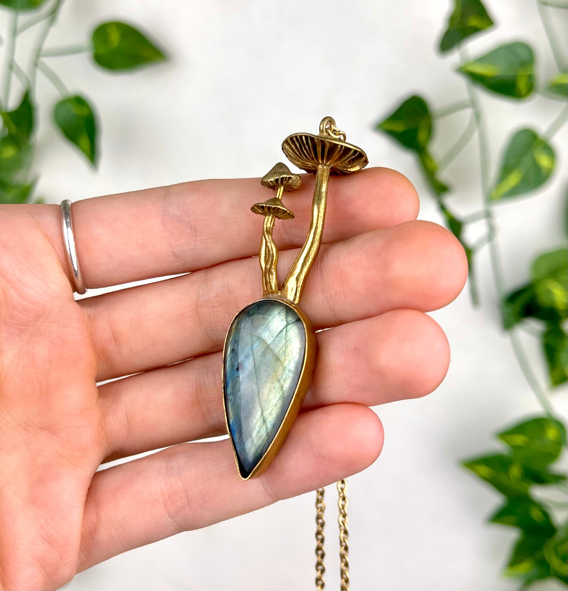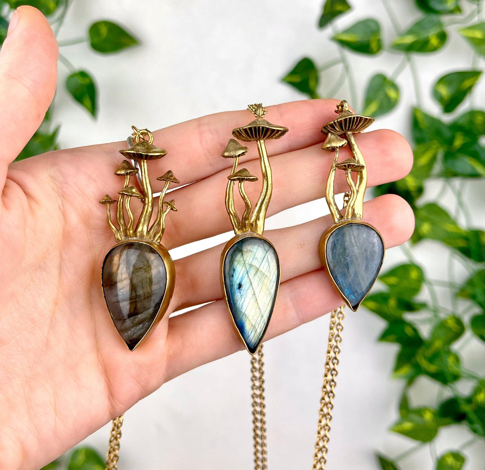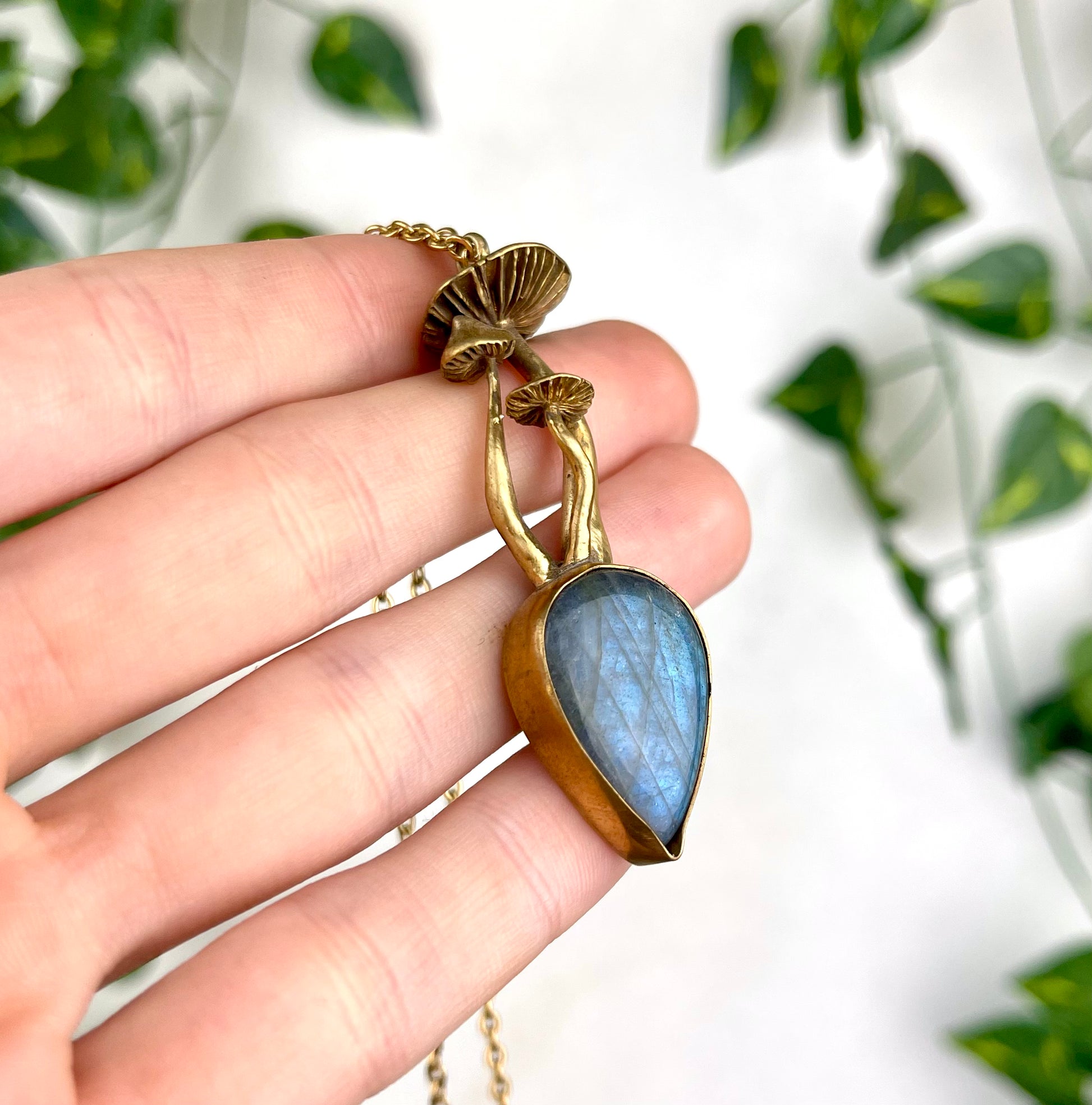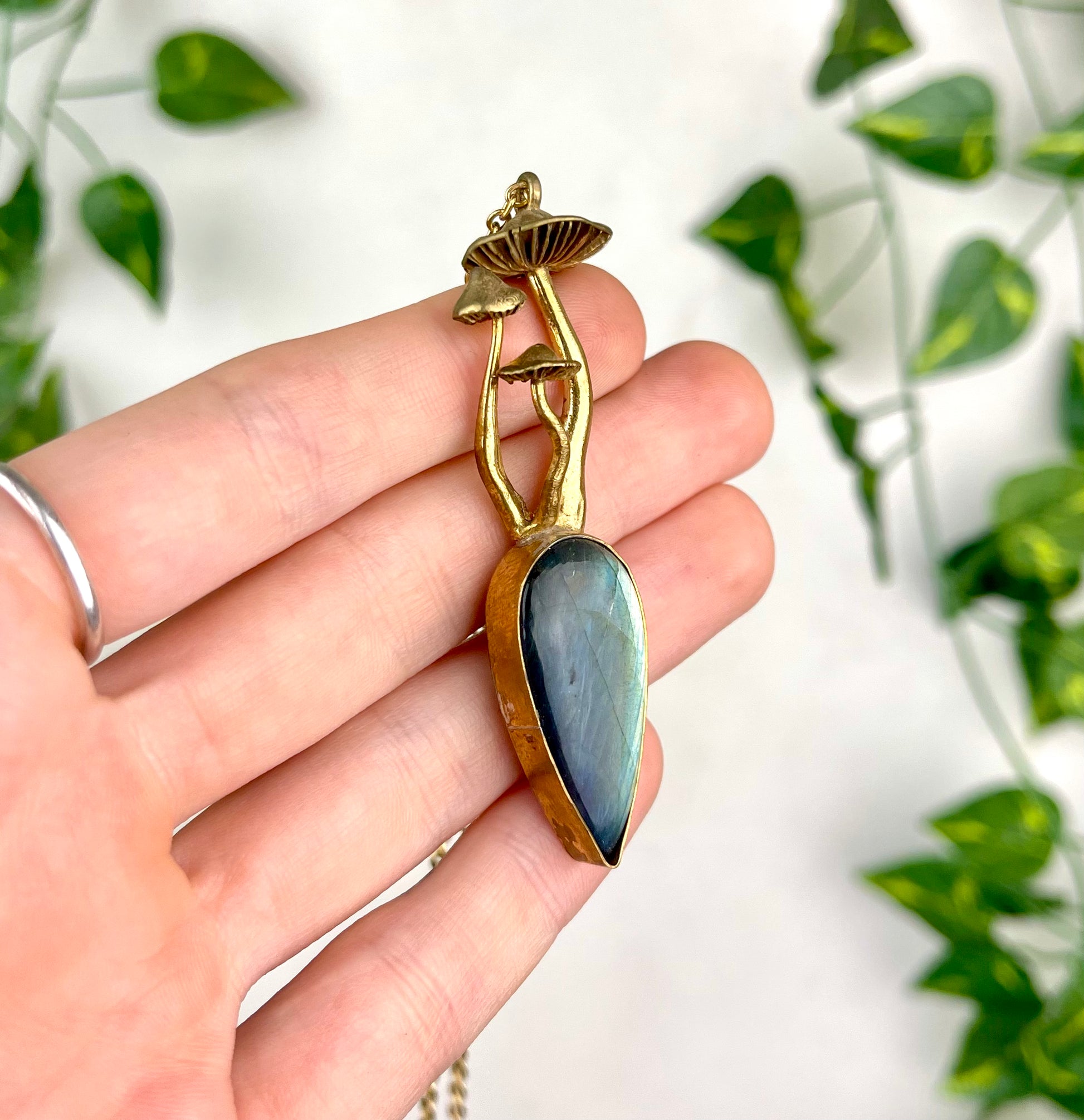Step into a woodland fairytale with this handcrafted brass mushroom necklace, featuring a captivating Labradorite crystal. This charming piece brings a touch of magical forest whimsy to your style, perfect for nature lovers and dreamers alike! 🍄✨