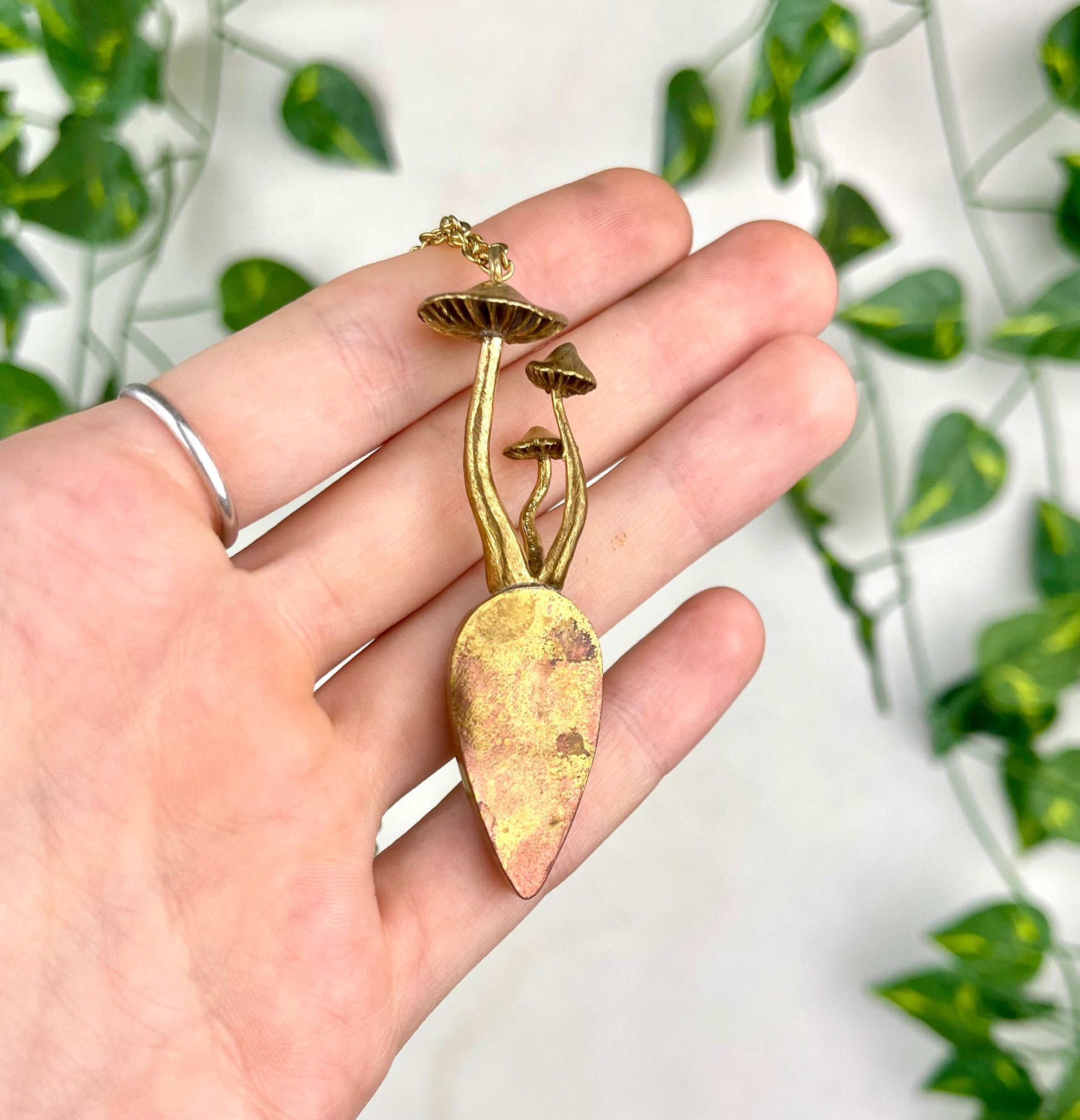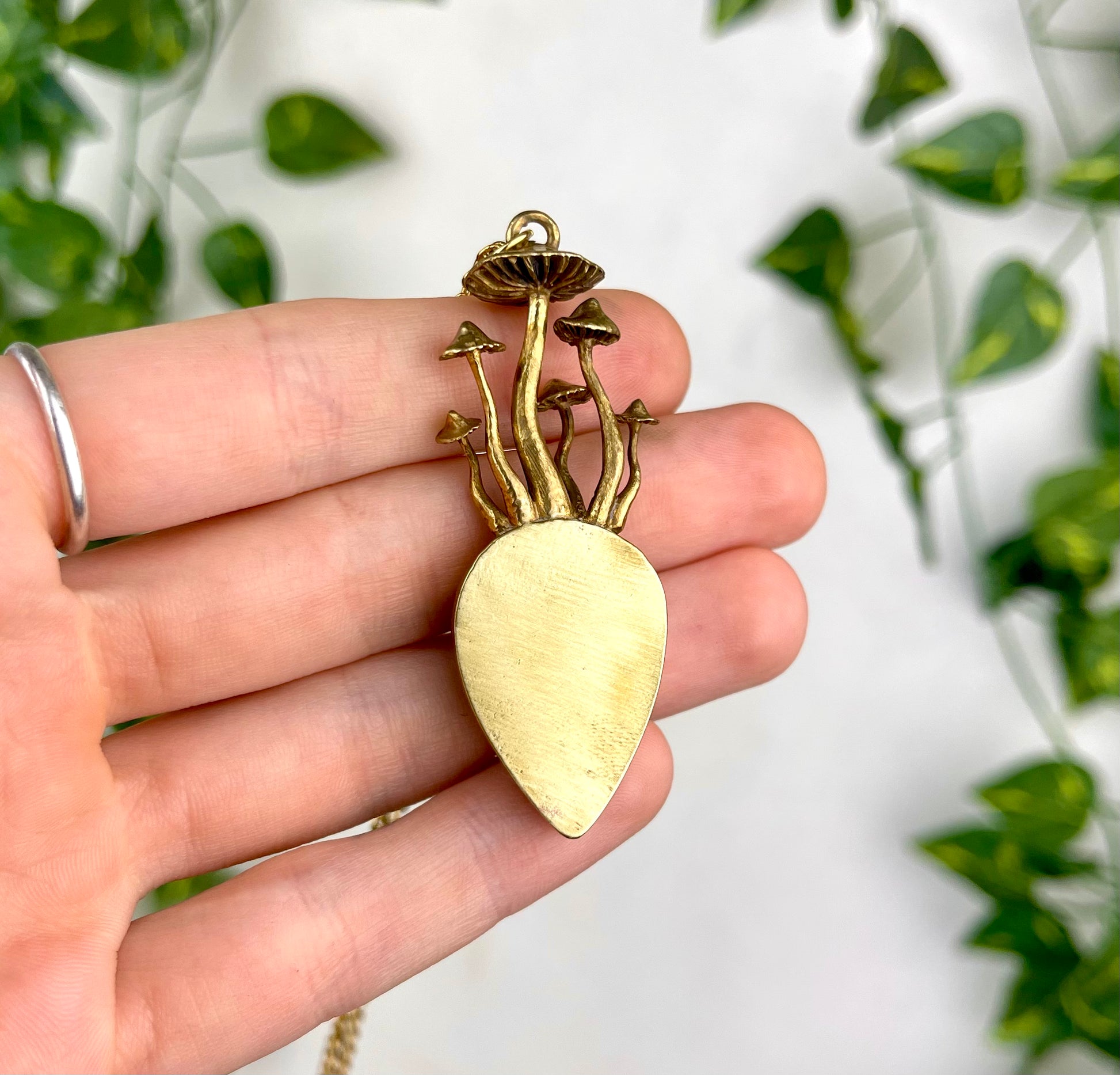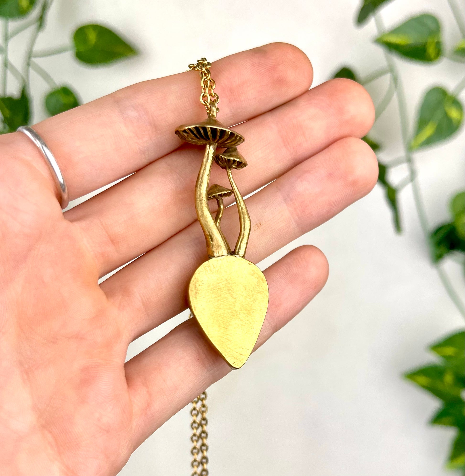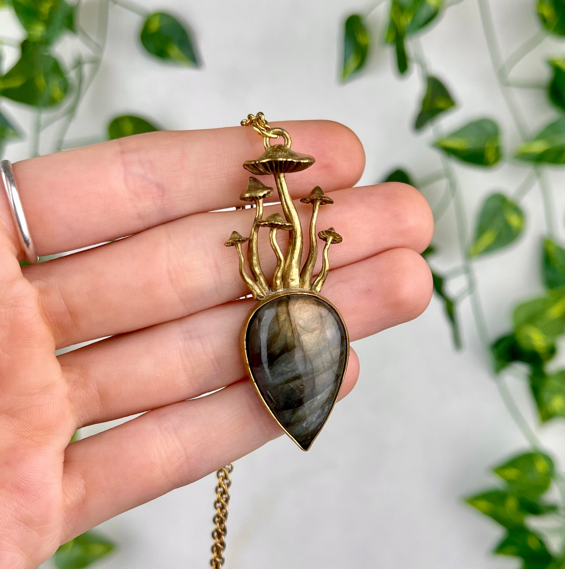 Step into a woodland fairytale with this handcrafted brass mushroom necklace, featuring a captivating Labradorite crystal. This charming piece brings a touch of magical forest whimsy to your style, perfect for nature lovers and dreamers alike! 🍄✨