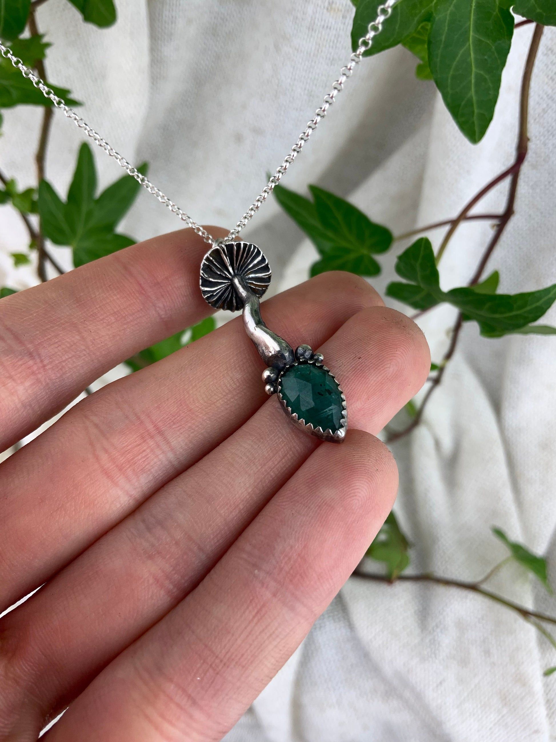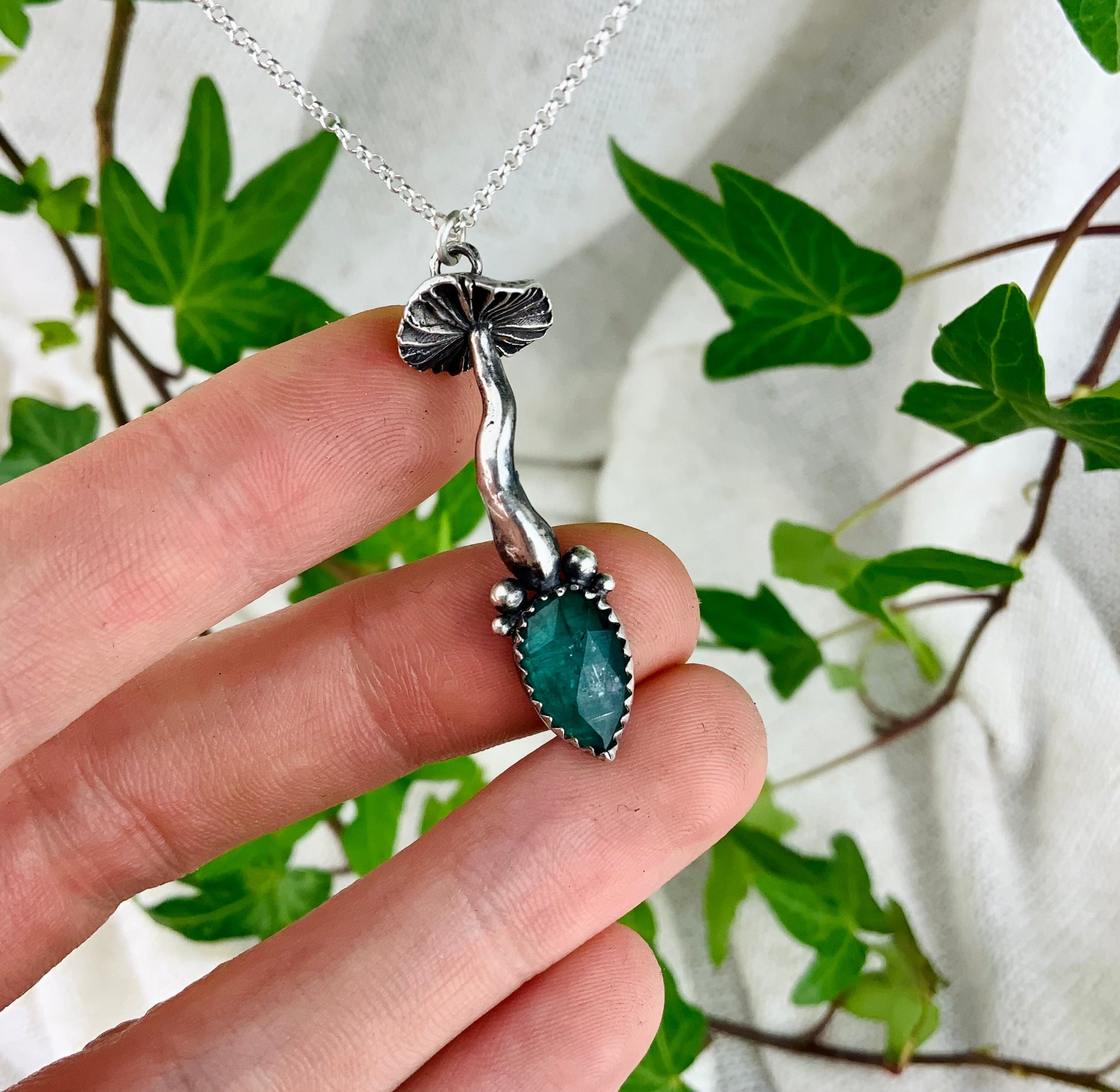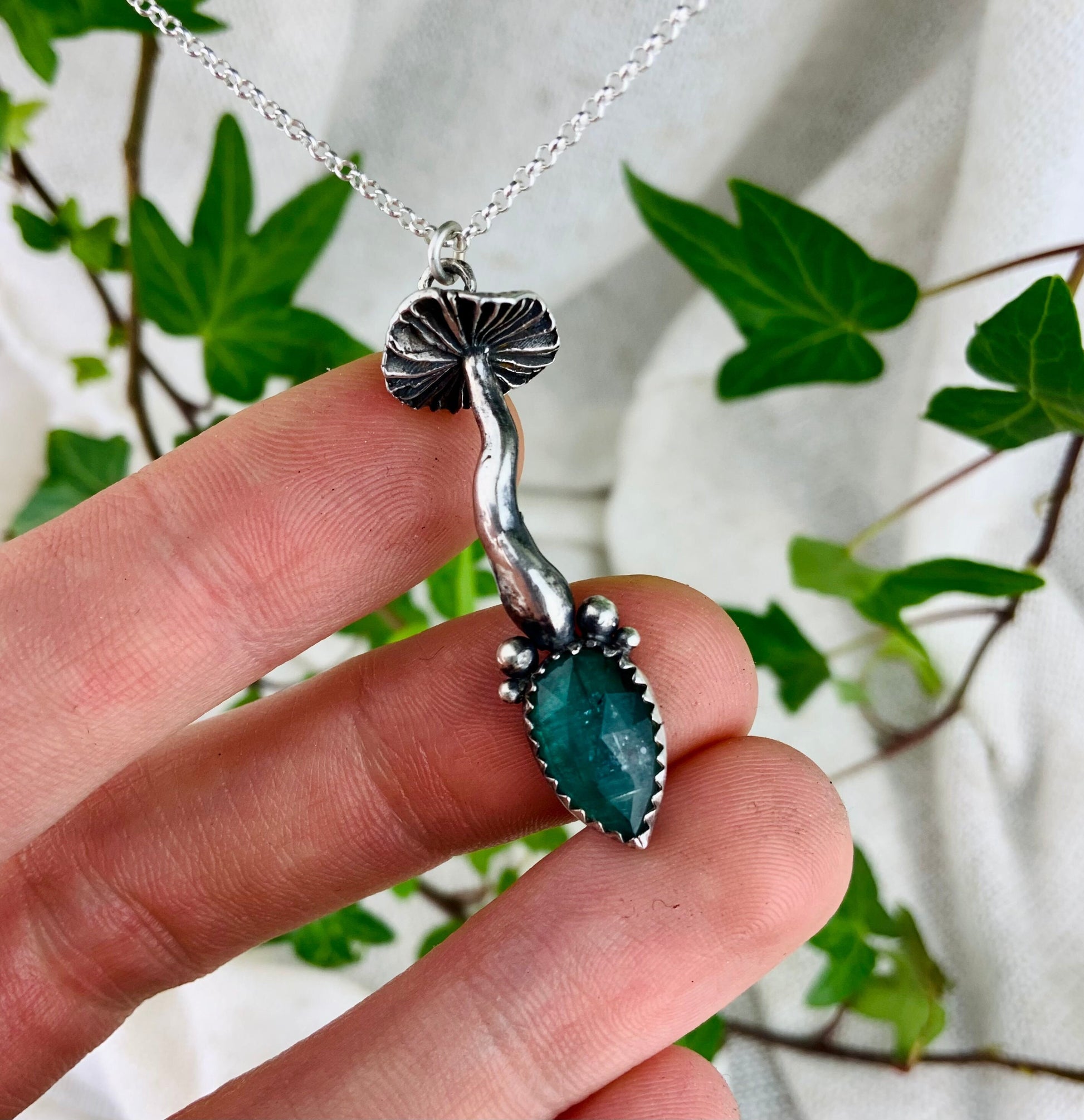 This Mushroom Necklace with a beautiful Teal Kyanite at its heart, is showcasing intricate details that mirror the real fungi found deep within the forest.
