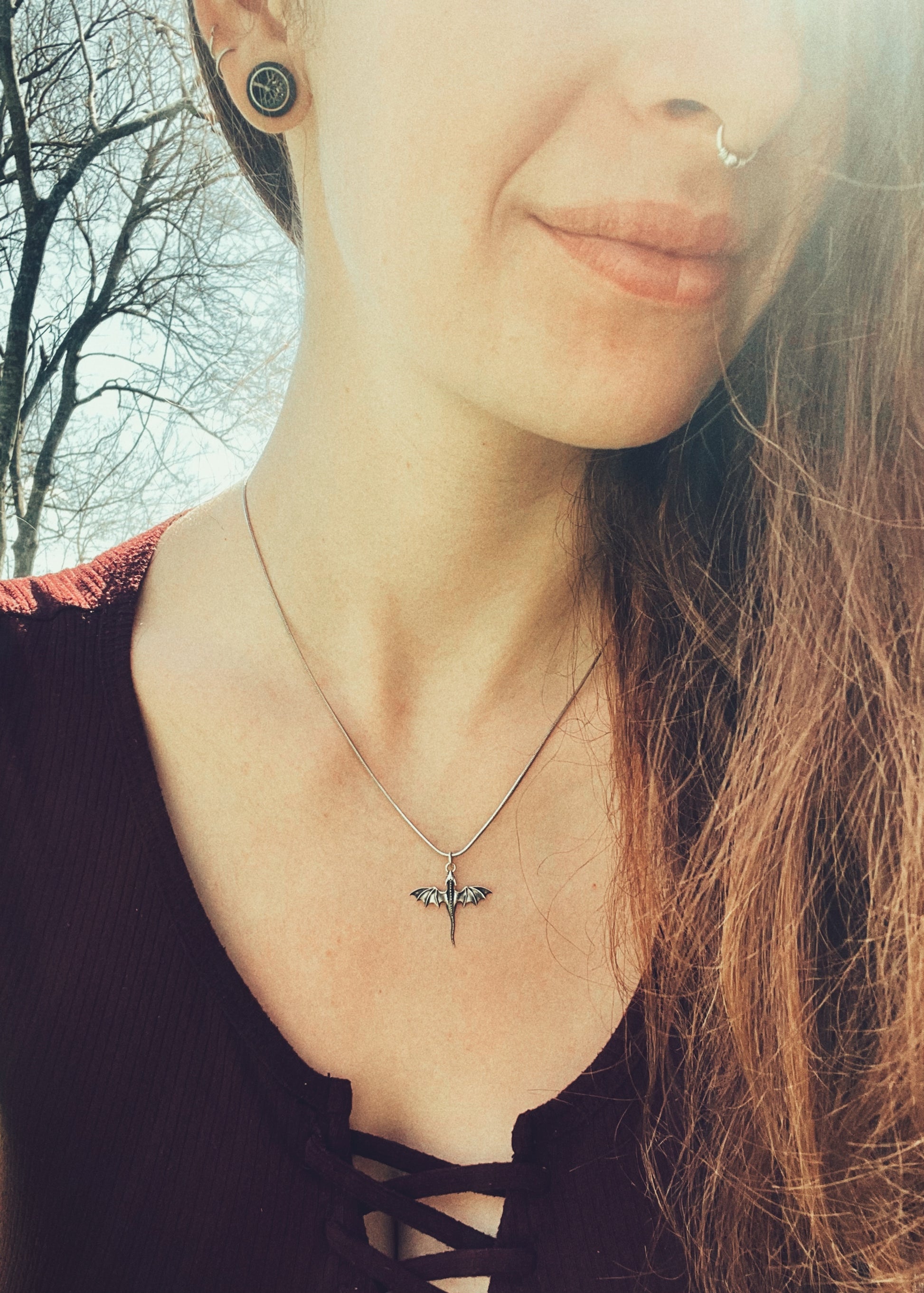 This intricately designed piece adds a touch of mythical elegance to any outfit. Perfect for fantasy lovers and unique jewelry collectors.