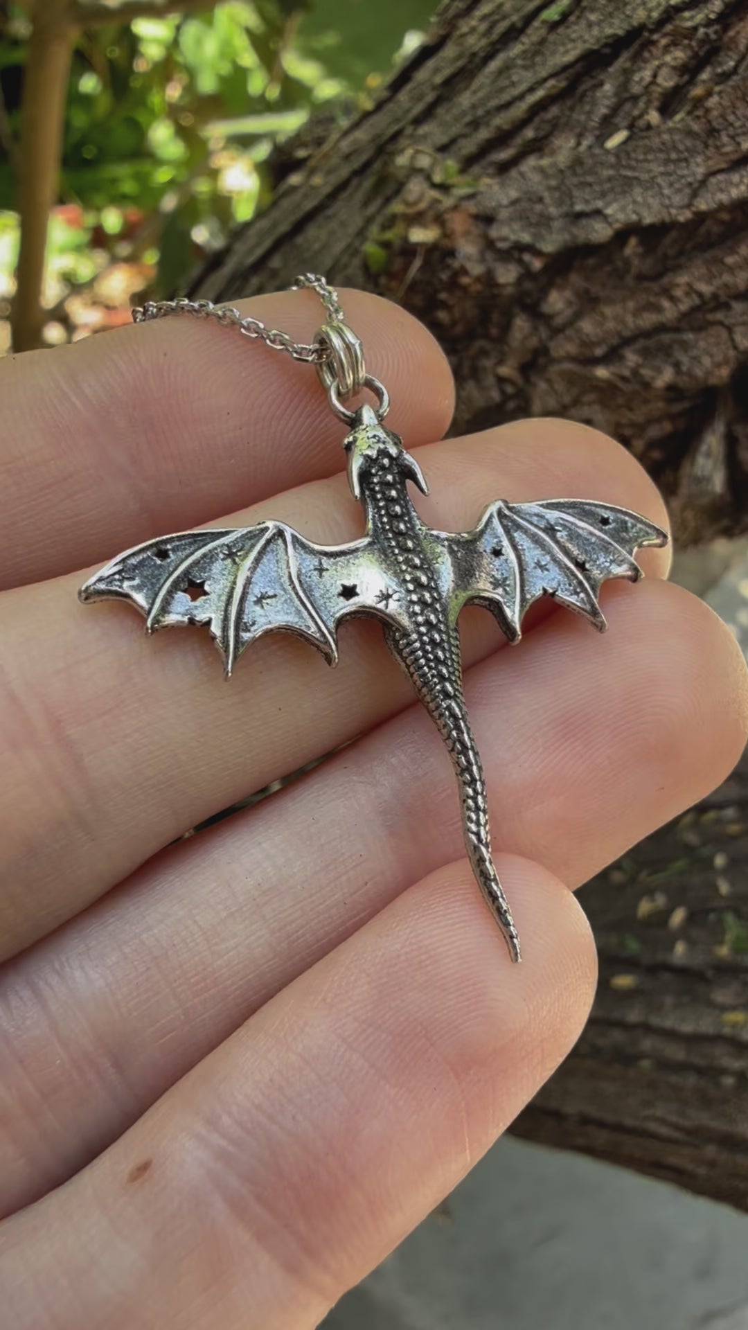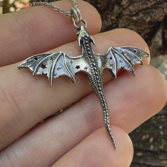 Bold and mystical, this 925 sterling silver dragon pendant features a detailed design with star-patterned wings—perfect for fantasy lovers