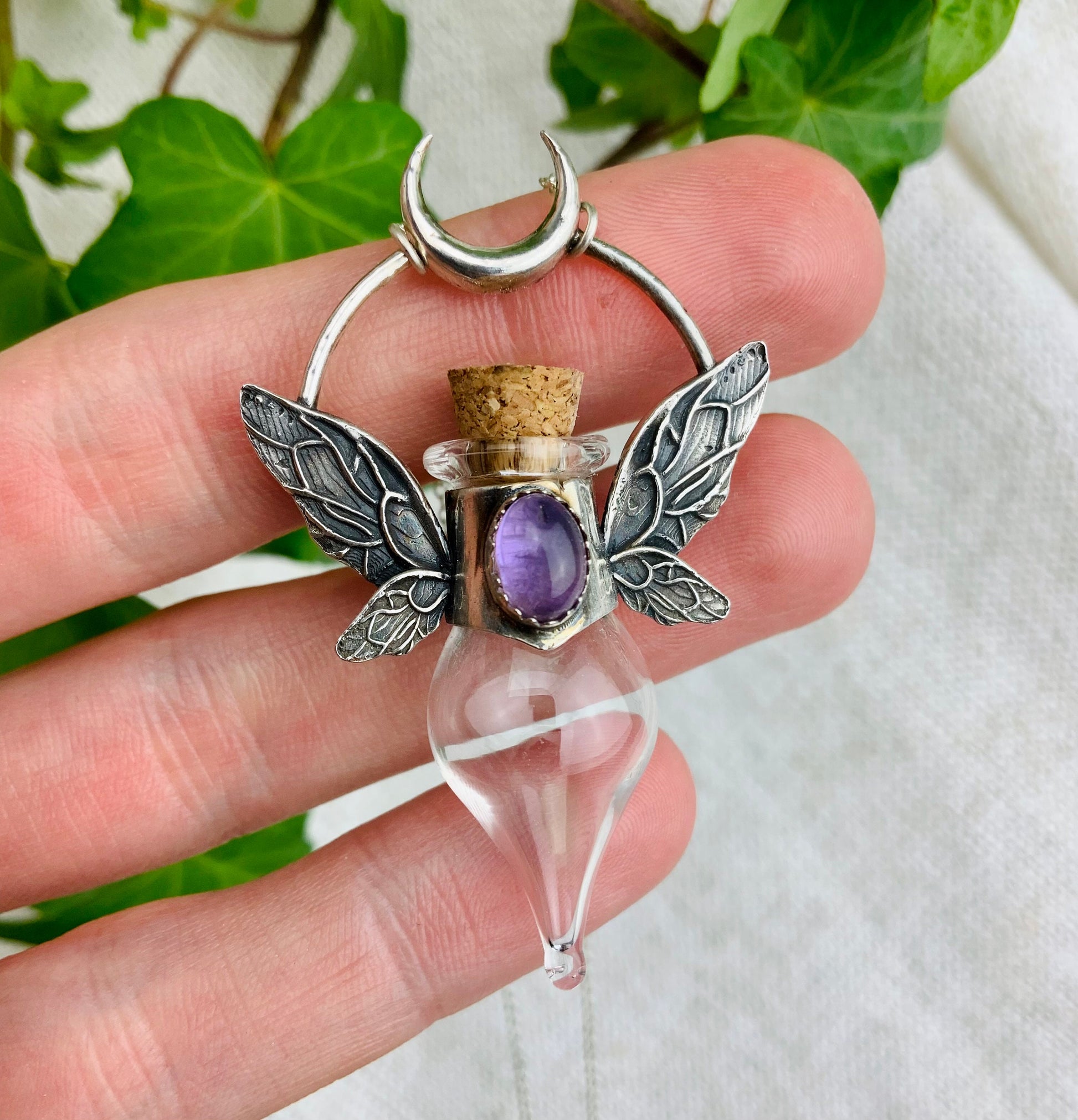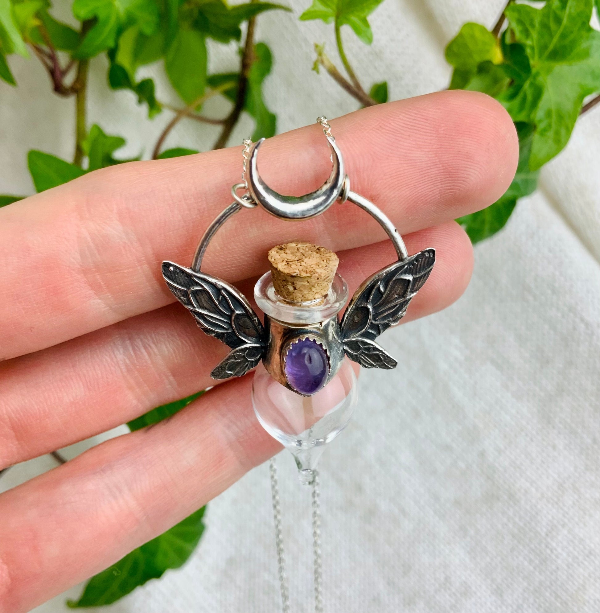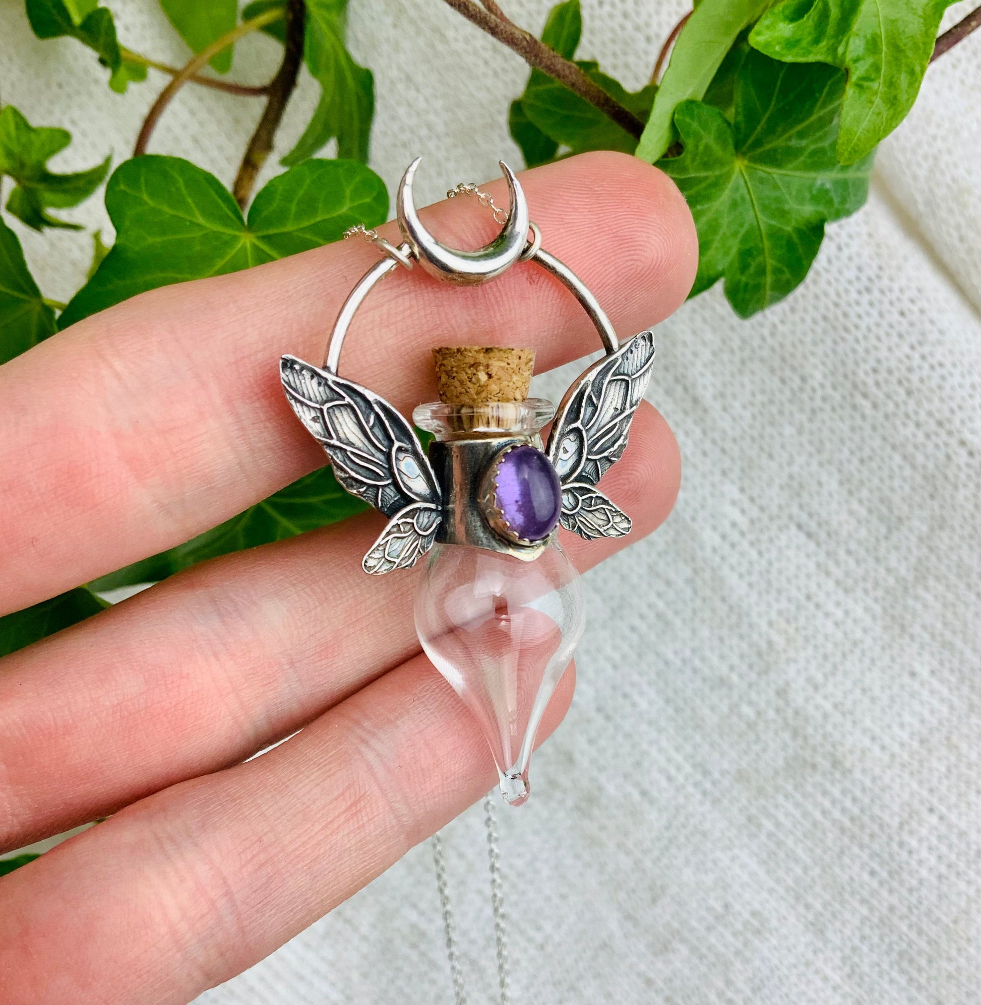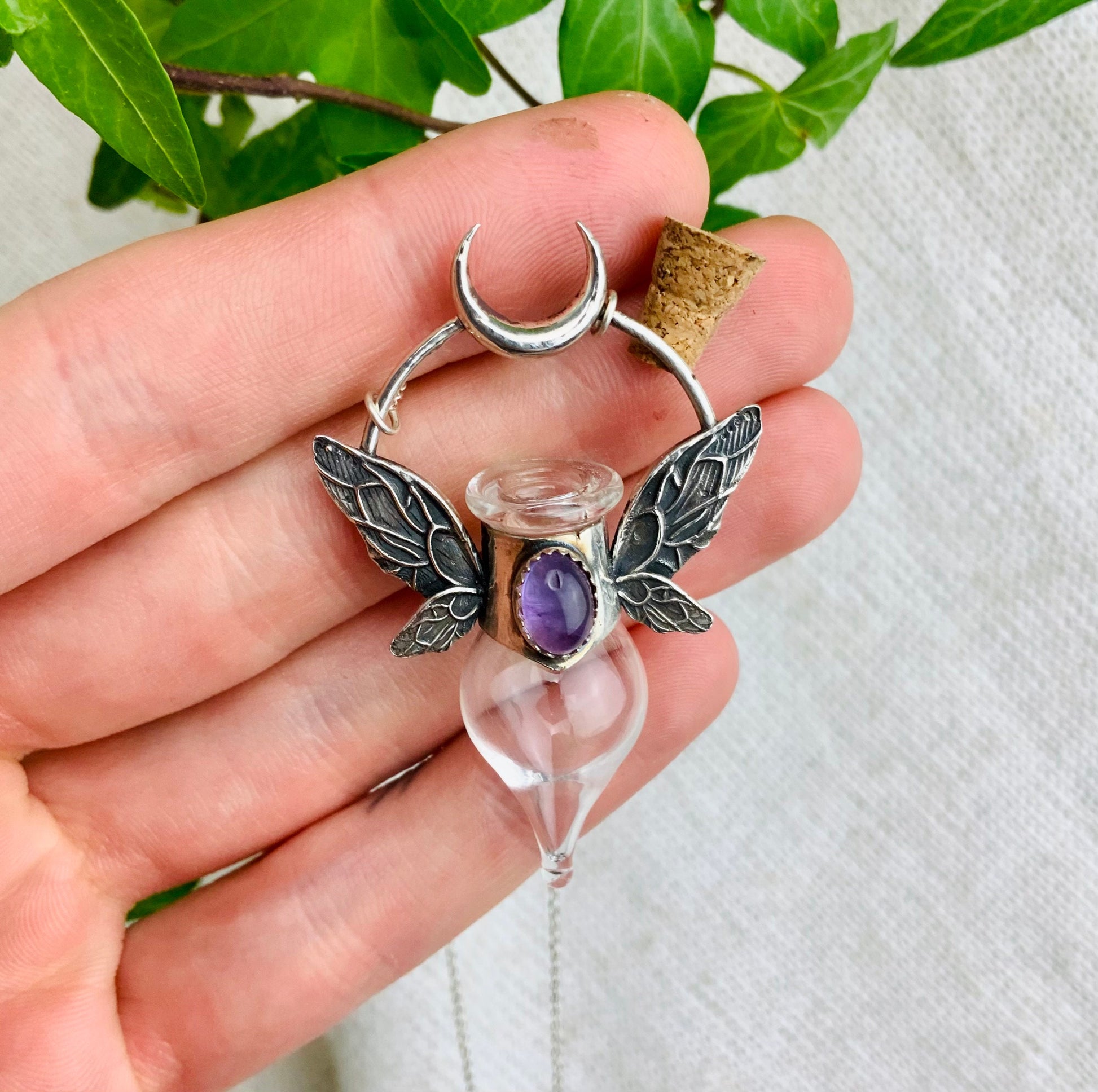 Magical Fairy bottle With wings is sterling silver Pendat with beautiful Amethyst Crystal.