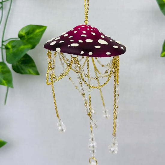 Bring a touch of rich, moody elegance to your space with the Black Tartarian Mushroom Sun Catcher. This striking piece features a deep, wine-toned mushroom cap inspired by the dark luster of ripe black cherries. Its dramatic color and golden details make it a captivating accent for any room or garden, balancing mystery with refinement.