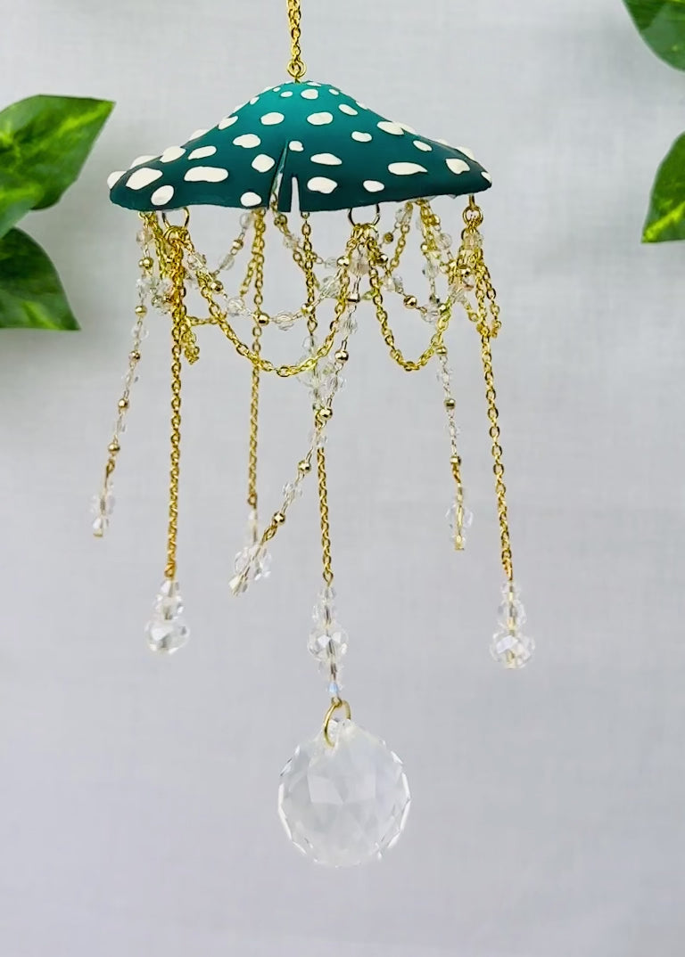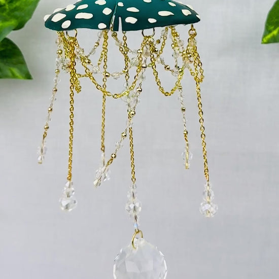 Add a hint of mystery to your space with the Midnight Moss Mushroom Sun Catcher. Its deep forest green cap and shimmering gold chains create a calm, elegant look that feels both earthy and magical. Hang it near a window or in your garden to catch the light and bring a soft touch of enchantment to any setting.